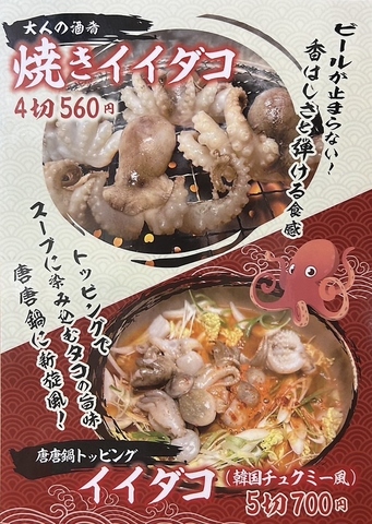 香ばしく焼き上げた「焼きイイダコ」は弾ける食感でビールが止まらない!さらに唐唐鍋に新登場、旨辛スープにイイダコをトッピングすれば韓国チュクミ風に!濃厚な旨みと食べ応え抜群の一品に。