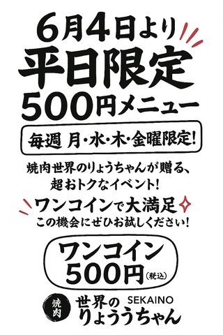 黒毛和牛のカルビ等々りょうちゃん大人気のメニューが大変お得にお楽しみいただけます!これを機に是非【焼肉世界のりょうちゃん】ご来店お待ちしております!