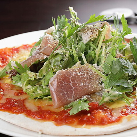 当店一番人気のピッツァです。フレッシュな生野菜にとうもろこしのソース、生ハムを散らした見た目にも驚く、サラダピッツァです。