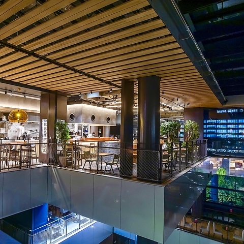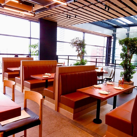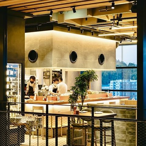 ISOLA熊本は「アミュプラザくまもと」7階にあり、窓側席からは熊本駅周辺を一望出来るロケーションにあります。店内は1階から7階までの吹き抜け空間に面しており、真下には立体庭園「ぼうけんの杜」、上空には滝が流れています。広々として解放感のある店内は換気も良く安心してお食事頂けます。