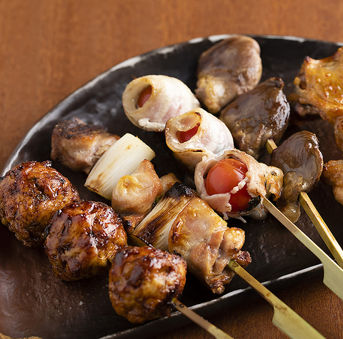 こだわりのブランド鶏!焼き鳥や串揚げ、お酒との相性抜群のお料理を多数ご用意しております。焼き鳥は一本一本丁寧に焼きあげておりますので、ぜひ当店の焼き鳥を一度お召し上がりください。