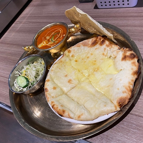 【サラダ/パパド/選べるチーズナン(チーズナン/パンプキンチーズナン/ハーブチーズナン/ガーリックチーズナン)/バターチキンカリー】 ※カリーの辛さは6段階。お好みの辛さをお選びいただけます《甘口(お子さま向き)/マイルド(0倍)/中辛(2~3倍)/辛口(4~5倍)/激辛(20~25倍)/極辛(50倍!!)》