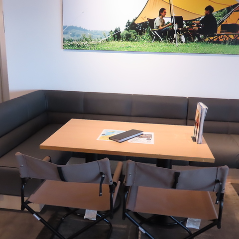 スノーピークのキャンプギアを使用したお席で、室内にいながらキャンプ気分を味わえるお席をご用意しております。