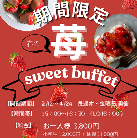 農家直送朝採れイチゴをたっぷりご準備!軽食からイチゴスイーツが盛りだくさん。お飲み物までイチゴ使用!毎週木・金曜日限定開催 15:00~16:30(LO16:00)お子様連れ大歓迎です。