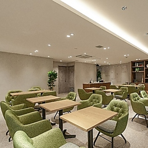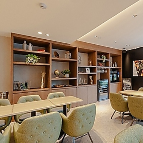 広々とした店内は、大きな窓からたっぷりと自然光が差し込み、明るく開放的な雰囲気が魅力です。ゆったりとしたグリーンのチェアとシンプルな木製テーブルが調和し、リラックスできる居心地の良さを実現。ご友人とのお食事やデートなど幅広くご利用いただけます。