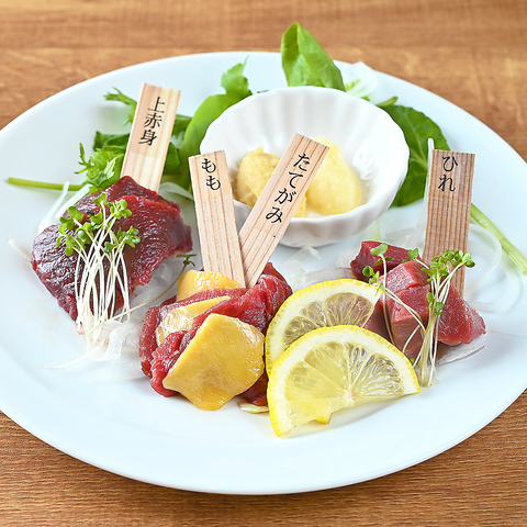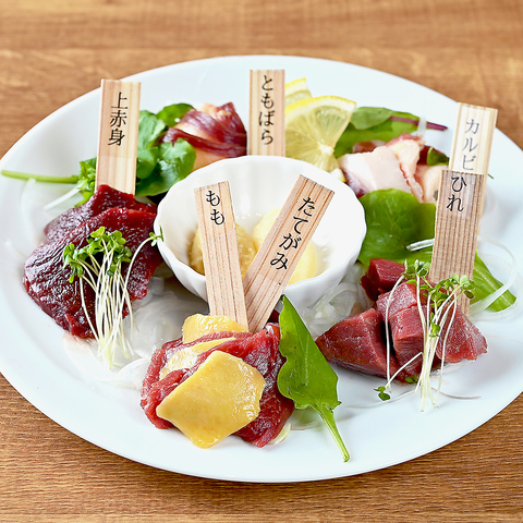 当店自慢の売れ筋メニューである、豪華5点盛り合わせは来店の際に是非頼んで頂きたい逸品です。馬肉専門店ならではの新鮮でボリューム抜群の馬刺しになっており、かつなかなか味わえない希少部位がリーズナブルな価格で提供致します。馬肉専門店だからこそできる、馬肉をふんだんに使用したアラカルトメニューも多数ご用意!