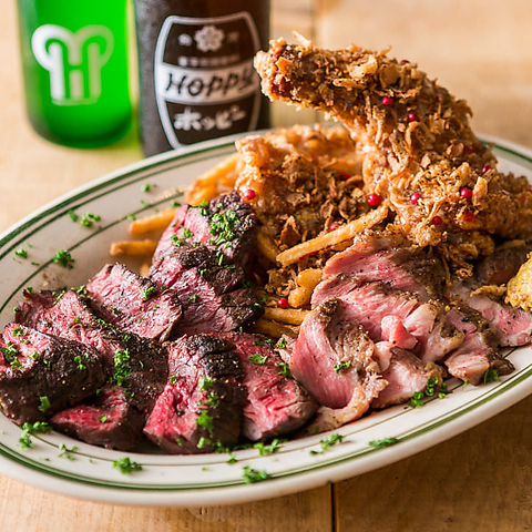 USバベットステーキ・豚肩ロースのグリル・ラムチョップ・鶏モモ肉の4種の盛り合わせです。ファンの方もとても多い人気メニュー。もつ肉店系列だからこそ仕入れられる新鮮なお肉をご堪能ください