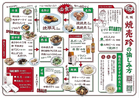 まずはハイボールで1杯START!!次に名物焼売、焼き豚足を注文!焼売・焼豚足は焼き時間に少しお時間をいただくため、お待ちの間に「冷菜」「豚中華」「熱菜」の数々や、当店自慢の「黒ボール」「茶酎」「ドラゴンボール」等もお楽しみください♪そして〆には「卵チャーハン」「にんにく麺」「ルーロー飯」、「中華ポテト」をお楽しみください◎