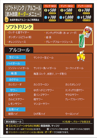 新大久保で韓国旅行に行った気分を満喫できるように韓国アルコールドリンクもたくさん用意しております。【ランチ90分飲み放題】アルコール込み770円(税込)【ディナー90分飲み放題】アルコール込み1100円(税込)【ディナー120分飲み放題】アルコール込み1320円(税込)