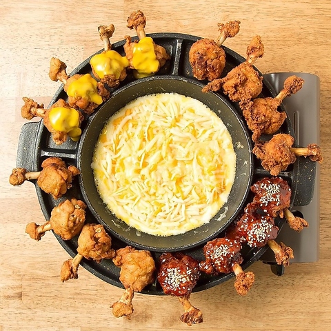 今話題のUFOフォンデュを当店で楽しんでみませんか?新大久保で人気のUFOフォンデュがここでも味わえます◎円盤型の鉄板に並ぶ味付きチキンを中央のとろ~りチーズにディップして、皆で楽しむ新感覚の食体験です。ぜひお友達や家族と一緒にお召し上がりください!