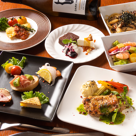 2名様からご利用頂けるコースをご用意致しました。前菜にはじまりサラダ、メインの魚介やお肉と使った料理、パスタ、デザートの計7品!お食事をゆったりと楽しんで頂ける2時間飲み放題付きです。