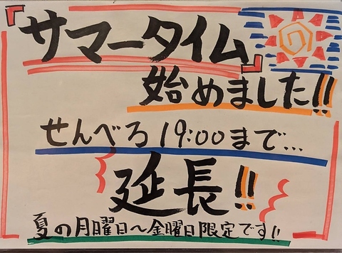 夏限定!平日限定で通常18:00までのせんべろを19:00まで延長!