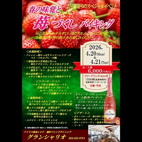 2日間限りのイベント「春の味覚と苺づくしバイキング」を開催いたします。※予約制です