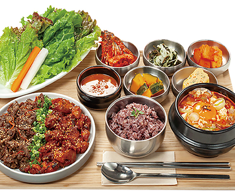 包み野菜と一緒に楽しむサムパランチ定食。ヘルシーで満足感のある人気ランチです。