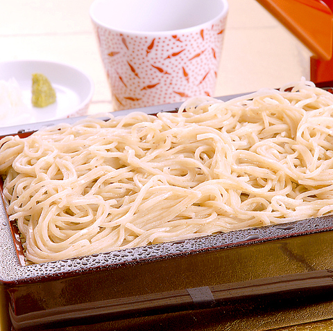 北海道産または越前の厳選した蕎麦粉のみを使い、1:9でそば粉を9割使用しております!蕎麦の実の中心にある真っ白な部分(胚乳部)を贅沢に使い、しかし更科にしばられることなく、蕎麦本来の甘味と香りを引き出しました。蕎麦つゆはじっくりと寝かした返しと利尻昆布と枕崎の鰹節をはじめとし、更に数種のだしを加えた自家製のつゆです。
