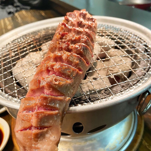 タンが本当に丸ごと1本でご提供いたします。見た目のインパクト・ボリューム・厚切りタンの味わい三拍子そろって満足いただけます。両面焼けて来たら、ハサミで切ってお召し上がりください先っぽの方はコリコリした食感♪根元に行くにつれて脂が乗ってジューシーで柔らかく先から元までお楽しみください。