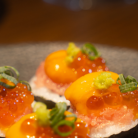 和牛と鮪のコンビネーションを楽しむことができるOKIBI AIBE。厳選食材を趣向を凝らして仕上げたオリジナルの創作料理をご堪能ください。贅沢なコンビネーションを楽しめる『和牛とまぐろの生うに包み』や、3層からなる鮪と和牛のハーモニーを堪能できる『ローストビーフとまぐろのユッケ いくらのせ』はお店を代表する必食のメニューです。