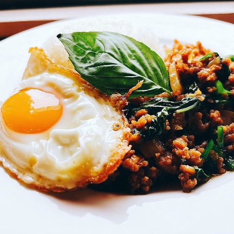 タイでも人気の定番ガパオライス。たっぷりの野菜とひき肉のバジル炒めごはんです。目玉焼きを割ってとろ~り黄身を絡めて食べると最高!辛さがちょうどよく、追いパクチーすることも可能です◎