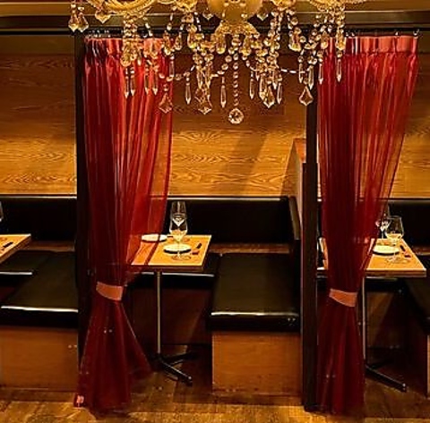 【大切な人と過ごす、2名様用半個室席】デートや大切な方との特別な時間におすすめの、2名様用半個室席をご用意しています♪プライベート感を重視した特別なお席です。お席の前はカーテンで仕切ることができるため、周りを気にせず、2人だけの空間でゆったりとくつろげます.ので、女子2名様にも人気のお席になってます。