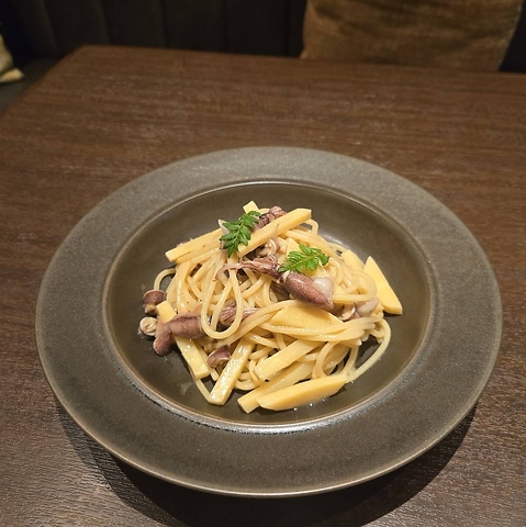 ★ホタルイカと筍のオイルパスタ★フレッシュの筍とホタルイカのシンプルなオイルパスタ。筍の甘みとホタルイカの旨み、春を感じる一品。木の芽と共にお召し上がりください。