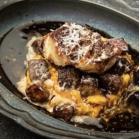 とろけるような食感に仕上げた卵料理の上に、ブランド牛と高級食材を重ねた至福の一皿。仕上げに振りかける濃厚なチーズと芳醇なトリュフが香るペリグーソースが、深みのある味わいを演出します◎看板と呼ぶにふさわしい逸品が、特別な日のディナーを華やかに彩ります。