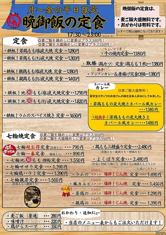 晩御飯の定食17:30~23:00(ラストオーダー)晩御飯の定食は、麦ご飯大盛無料です!※おかわりは有料です。