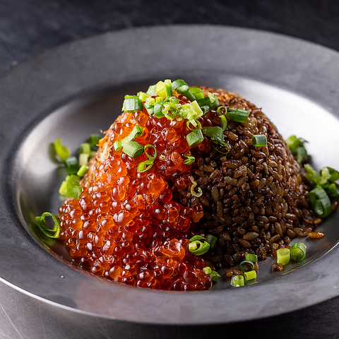 炒飯は油が決め手。FUNFANの炒飯には、牛脂を使用しており、肉の旨味がお米をコーティング。黒く輝く秘訣は中国醤油。上から新鮮ないくらをたっぷりと。いくらはあくまでもソースです。写真映え間違いなしの逸品。