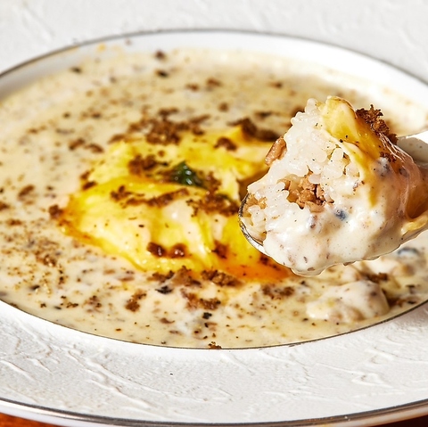6種のキノコの旨味がぎゅ~っと凝縮されたソースに、モッツァレラチーズを用いたとろ~りホワイトソースを合わせ、風味豊かな味わいとなっております。仕上げに贅沢なトリュフをトッピング!