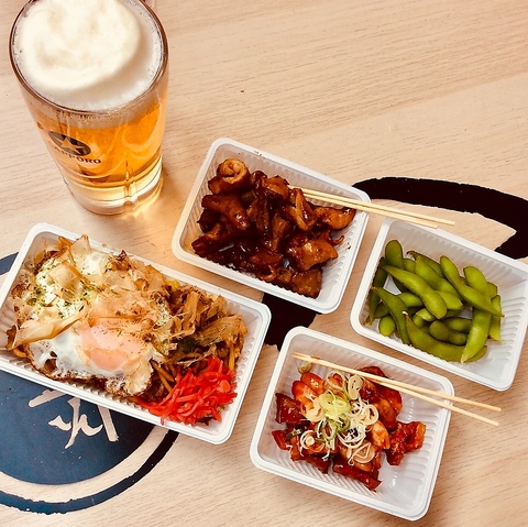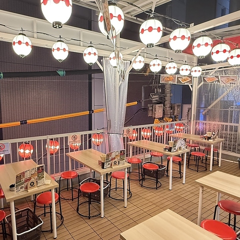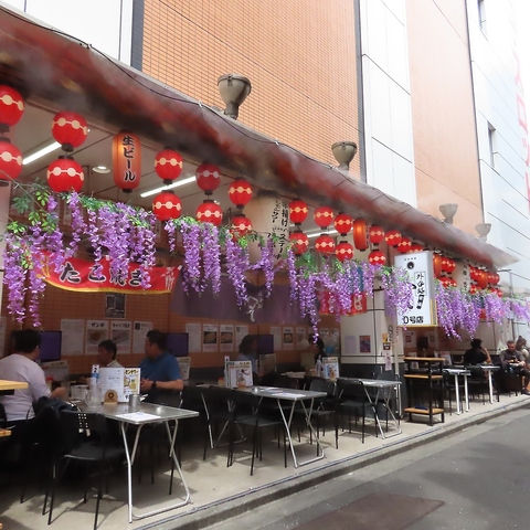 屋台の鉄板で焼く西成ホルモンをおつまみに開放感あるお席で外飲みできます!