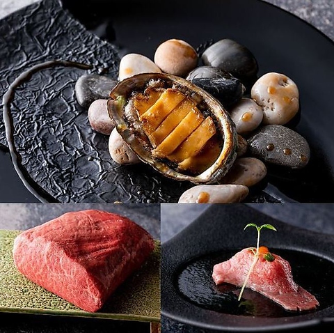 ちょうどいい食感に調理した『鮑』とステーキはランプやシンタマなどを使用してます。牛肉のうま味を感じることができる肉づくし全8品のコースです。