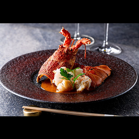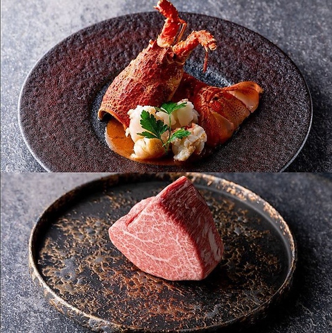 見た目にも花のある『イセエビ』と当店の『赤身』はランプやシンタマなどを使用してます。イセエビのぷりぷり感や牛肉のうま味を感じることができる全8品のコースです。