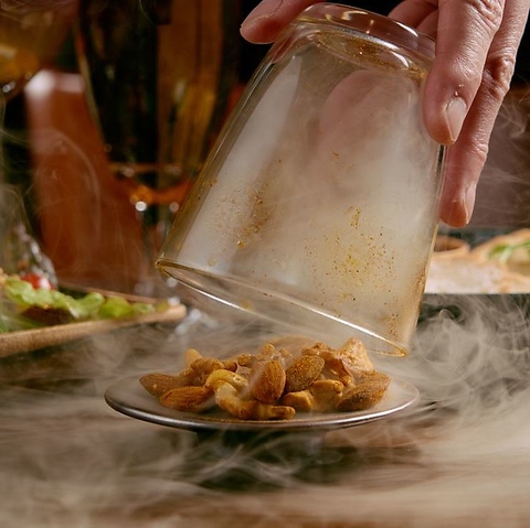 スパイスと合わせて煎りあげたミックスナッツを瞬間燻製して煙と一緒に ご提供。様々な香りが相まって、つい手が伸びるそんなヤツ。