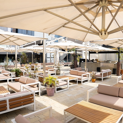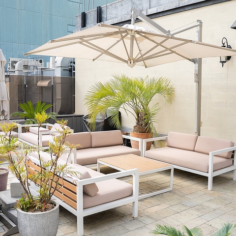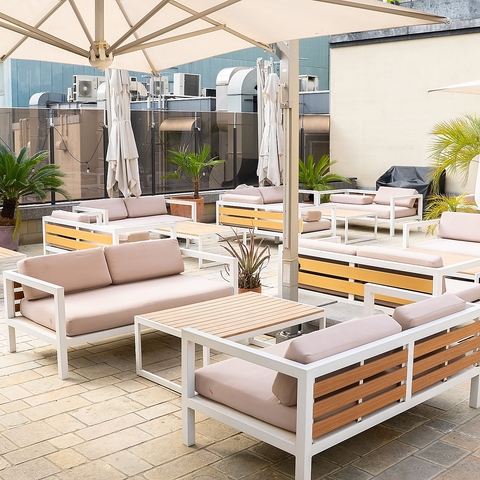 【ソファー席|2-4名様】ドラマティックな夜を過ごすならここ♪都会のルーフトップで叶える、ひとときの贅沢。まるで海外リゾートにいるかのような非日常気分を味わえるソファー席は、6名様から8名様までご利用可能。ラグジュアリーな空間で夜景を楽しみながら、ゆったりとお過ごしいただけます。