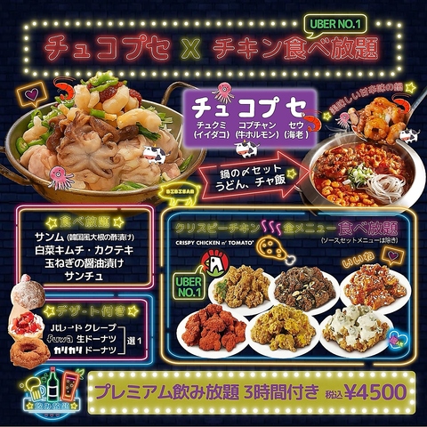 特製チュコプセ鍋を中心に、具材を楽しんだ後はうどん、さらに〆のチーズチャーハンまで味わえる満足度の高いコースです。CRISPYチキンほぼ全種、韓国おかず、キンパ、トッポギ、デザートもセット。3時間の飲み放題はビールに加え、韓国焼酎・マッコリもOKのプレミアム仕様です。前日予約限定4,500円でご利用いただけます。