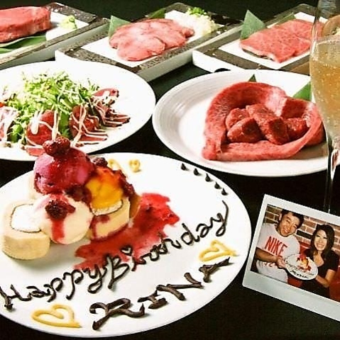 記念日には贅沢な焼肉ディナーでお祝いを♪乾杯ドリンクが付いた『記念日コース』をご用意。一頭から僅か数パーセント!希少部位の「シャトーブリアン」をメインに極上肉が続々登場。さらに「特選霜降りロース」と「特選カルビ」を盛り付けた「和牛肉ケーキ」でサプライズ♪「記念日プレート」で主役の笑顔もとびきりに♪