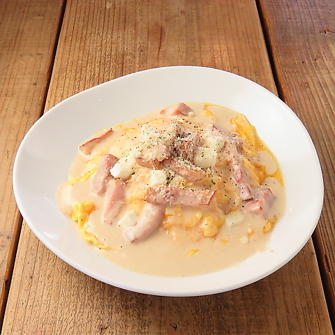 トロトロにとろけるモッツァレラチーズと、旨みたっぷりのベーコンが絡み合う濃厚カルボナーラソースが自慢のオムライス!ふわふわの卵と香ばしいベーコンのハーモニーが絶品で、食べ応えも満点。まろやかな味わいがクセになる一皿をぜひご賞味ください。