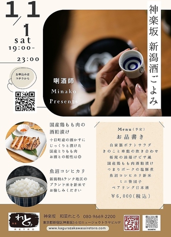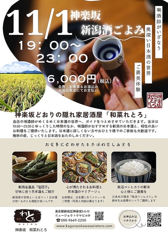 きき酒師minakoと楽しむイベントのお知らせ 11/1(土)19:00~23:00神楽坂和菜れとろにて\当店のきき酒師minakoが選ぶお酒を楽しむ会/『神楽坂新潟酒ごよみ』を開催します!「日本酒って難しそう…」「詳しくないけど興味ある!」そんな方にこそ来てほしいイベントですどなたでもご予約いただけます