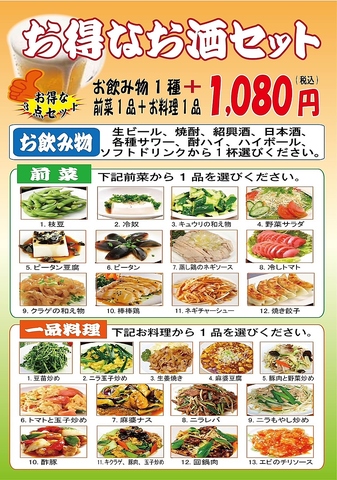 飲み物+前菜+料理1品ずつ付いて1188円(税込)!夜ご飯にも最適な大人気セット♪ちょっと飲みたい方に◎