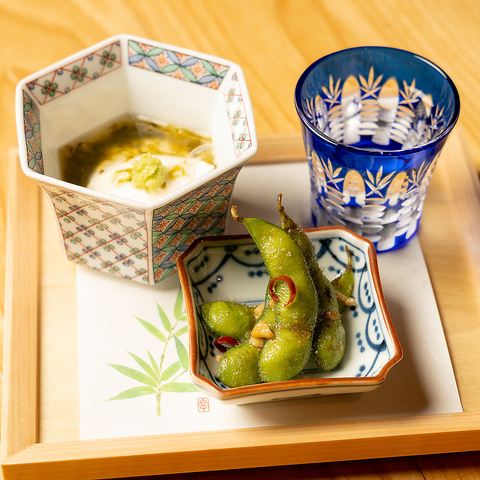 お通しには季節の食前酒付き。ノンアルも対応しております。