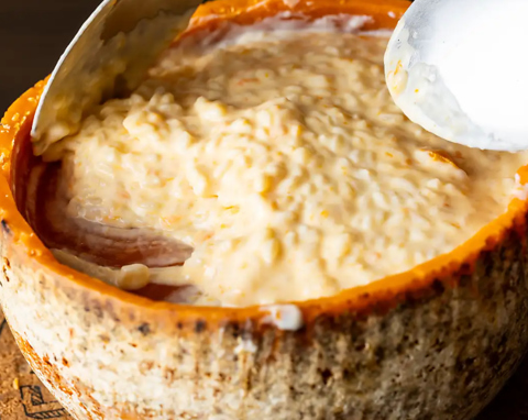 供直前にミモレットチーズをお皿にして混ぜてくれるライブ感のあるリゾット!1度食べたらやみつきになること、間違いなし!フランス産のハードチーズを丸々器として使い目の前で混ぜて仕上げます。