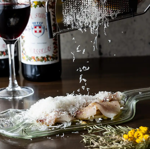 供直前にミモレットチーズをお皿にして混ぜてくれるライブ感のあるリゾット!1度食べたらやみつきになること、間違いなし!フランス産のハードチーズを丸々器として使い目の前で混ぜて仕上げます。