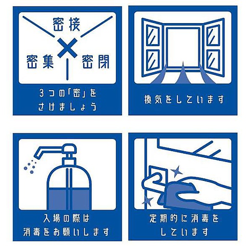 換気設備の設置と換気、多数の人が触れる箇所の消毒、備品/卓上設置物の消毒 |