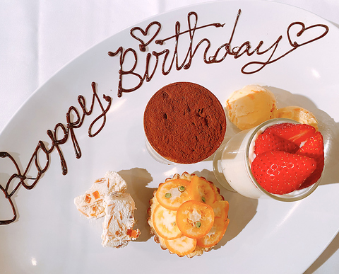 お誕生日・記念日等、皆様の大切な日を盛り上げるお手伝い致します!当日の飾り付けや、ご希望に沿ったスペシャルコース(※要お打ち合わせ)の対応も致します◎お祝いの際に人気の「メッセージプレート」もご用意(※事前予約制) 「いいとこどり/極UMAコース」をご利用の場合、コースのドルチェを【無料】でメッセージプレートに変更可能です!