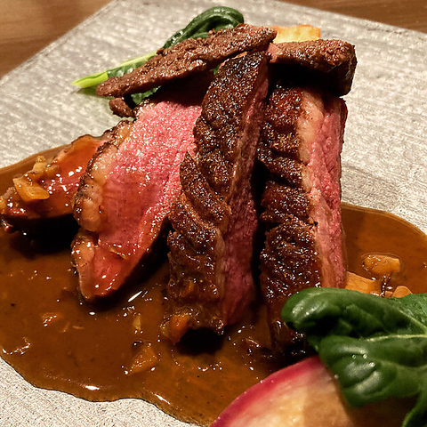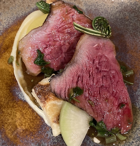 東御市の牧舎みねむらで大切に育てられた黒毛和牛のイチボ肉を炭火焼に。行者ニンニクを使ったソースを合わせて。※メニューは仕入れ状況によって変更になる場合があります。