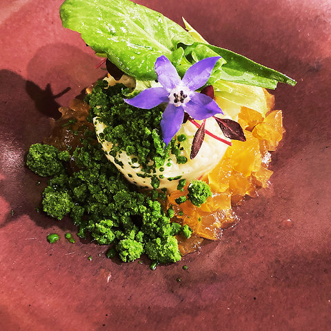 八千穂漁業さんの信州サーモンのマリネと松本市浜農場のグリーンアスパラを安曇野産の蕎麦粉を使ったガレットで包みました。安曇野産山葵を使ったサワークリームを添えて※メニューは仕入れ状況によって変更になる場合があります。