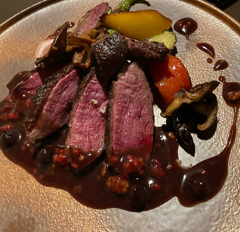 高山村の猟師さんより直接仕入れる鹿を炭火焼きに。黒胡椒を効かせたピリッとしたソースで。※メニューは仕入れ状況によって変更になる場合があります。