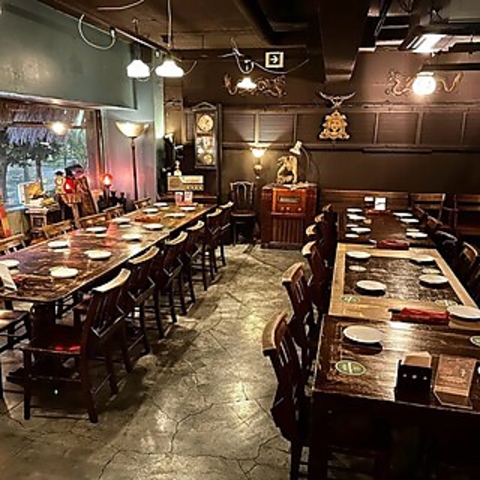 オリエンタルな空気感が楽しめる駅近ダイニングバー。重厚感のあるダークブラウンを基調とした中に、ヨーロピアンアンティーク家具やアジアンテイストのインテリアが並ぶ、他にはないオリジナルな空間です。