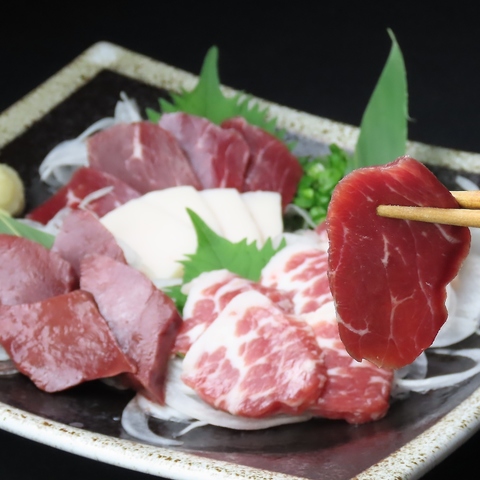 熊本名物【馬刺し】をレバ刺し・希少部位単品注文からお得な霜降り馬刺し付き5種盛りなどご堪能ください。