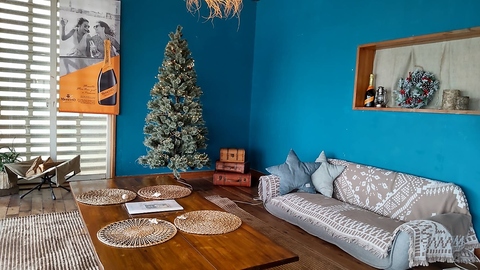 【まるで海外リゾート!心地よいリラックス空間】窓の外には広大な海が広がる居心地の良い店内。鮮やかなブルーの壁と木製家具、そしてハンモックがリゾート気分を盛り上げます。海を眺めながら、ゆったりとしたお食事の時間をお過ごしくださいませ♪