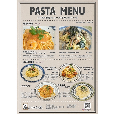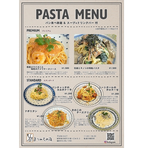 季節限定2種・定番4種の計6種類のパスタをご用意。パンは全品食べ放題!さらにスープ&ドリンクバー付きのとてもお得なセットです。